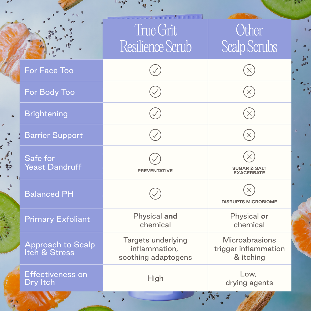 Unlike harsh scrubs that can irritate, True Grit Resilience Scrub combines physical and chemical exfoliation with hydrating, soothing ingredients, leaving your skin smooth, balanced, and hydrated.